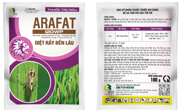 - Trên lúa: pha ARAFAT 120WP với liều lượng 30 – 40 g/bình 25 lít phun trên lúa để phòng trừ bọ trĩ, rầy nâu, rầy phấn trắng, bọ xít.