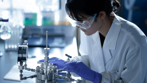 Kỹ sư S New Rice thực hiện kiểm định chất lượng sản phẩm tại phòng thí nghiệm.